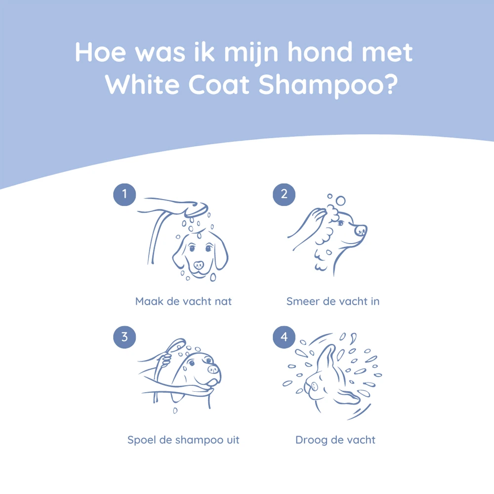 - Speciale shampoo voor honden met een witte of lichte vacht ter bevordering van de natuurlijke vachtkleur