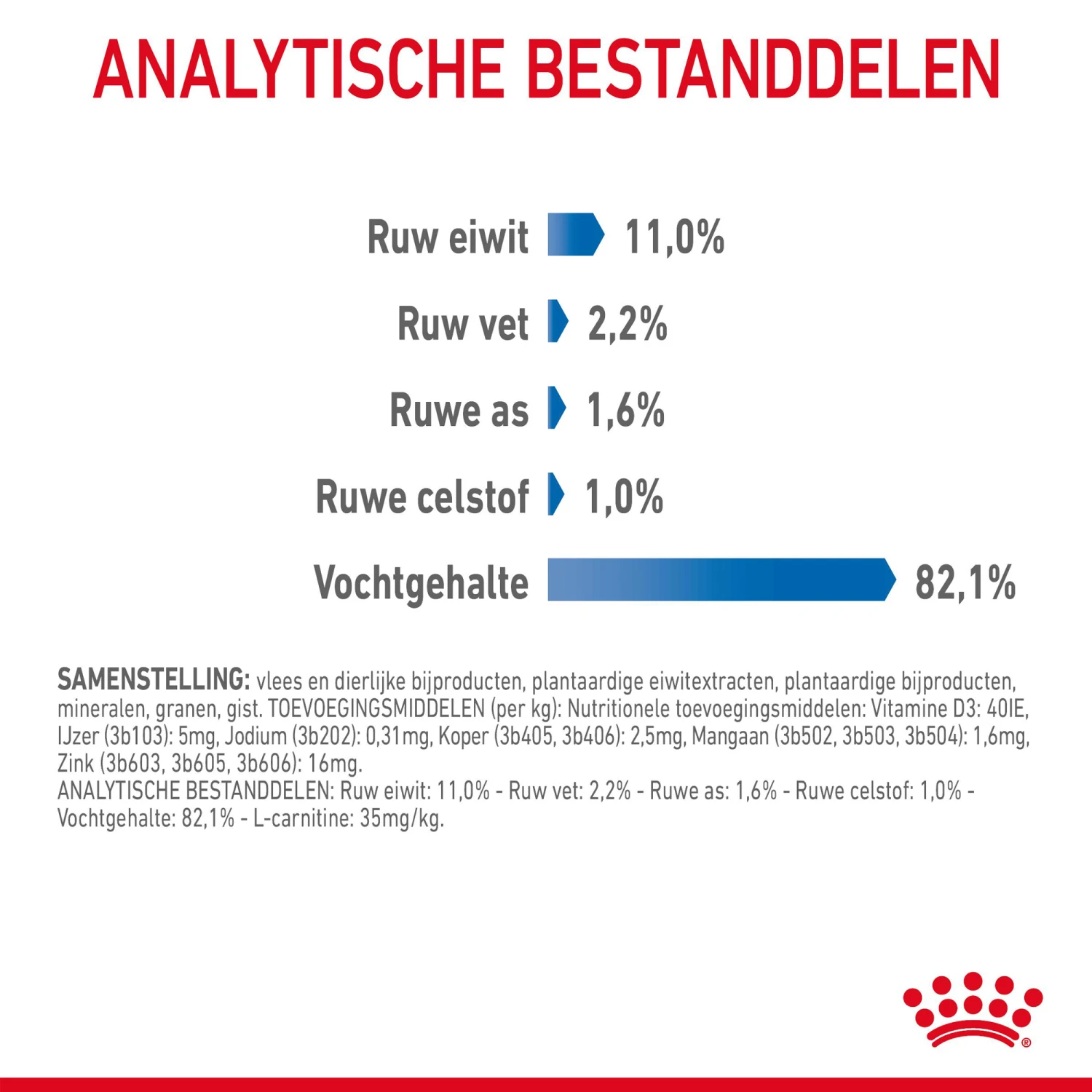 Als een kat (iets) te dik is, wordt de kans op gezondheidsproblemen groter. Denk bijvoorbeeld aan suikerziekte, gewrichtsklachten, leverproblemen of een slechte doorbloeding. Met de Light Weight Care in Jelly van Royal Canin beperk jij de calorie-inname van uw kat. Dit smakelijke voer van vleesblokjes in gelei bevat minder calorieën, dat bijdraagt aan minder calorie-inname voor een gezonder gewicht. Ook ondersteunt het natvoer de urinewegen en de spiermassa.