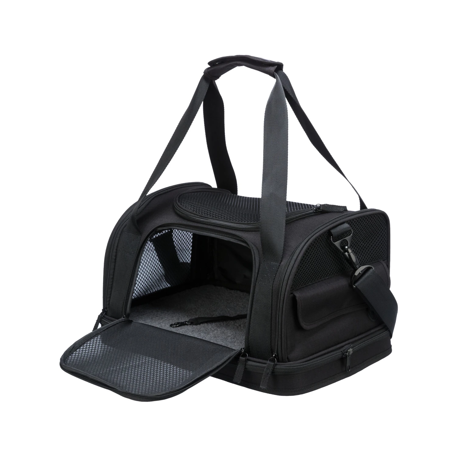 Wilt u uw (kleine) hond ook meenemen als handbagage in het vliegtuig? Met de Airline Tas Fly van Trixie kunt u met uw hond op een handige en veilige manier op reis met het vliegtuig. De tas heeft een formaat wat hem geschikt maakt om als handbagage gebruikt te worden. Deze tas is heel handig; u kunt hem namelijk bevestigen aan de trolley zodat u hem gemakkelijk mee kunt nemen. De tas is aan de zij-, voor- en bovenkant te openen. Hij heeft een buitenvak om spulletjes in op te bergen en twee handgrepen om de tas te dragen. De schouderriem is afneembaar en beschikt over een geïntegreerde korthouder. De bodemplaat is gevoerd en waterdicht voor extra stevigheid.